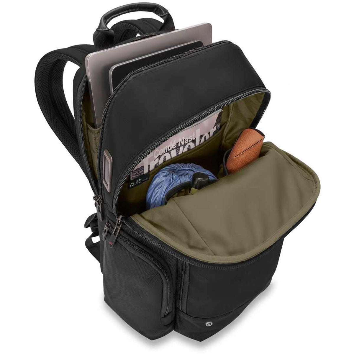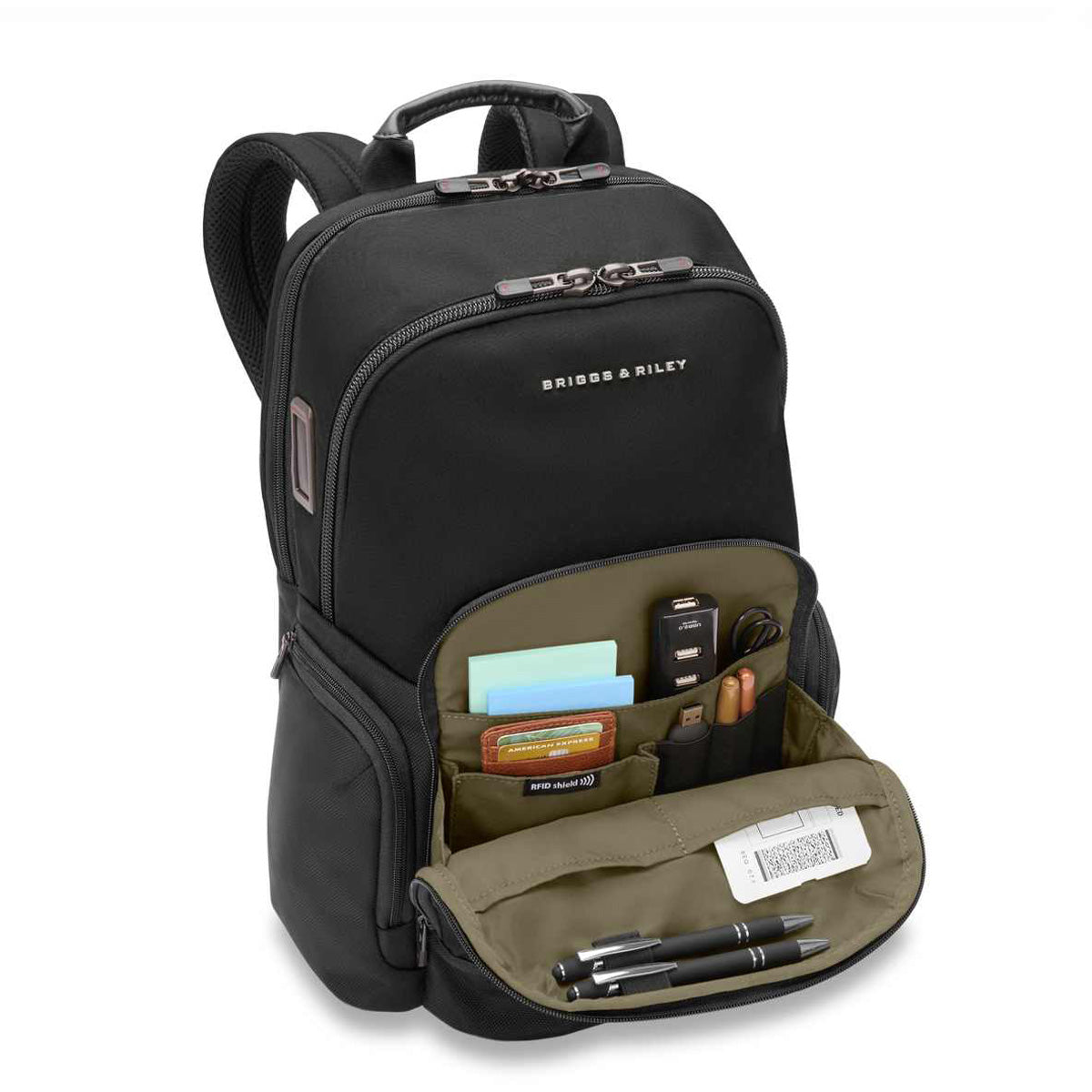 - Tech compartment features dual zipper pulls that can be used with a cable lock to keep contents secure.