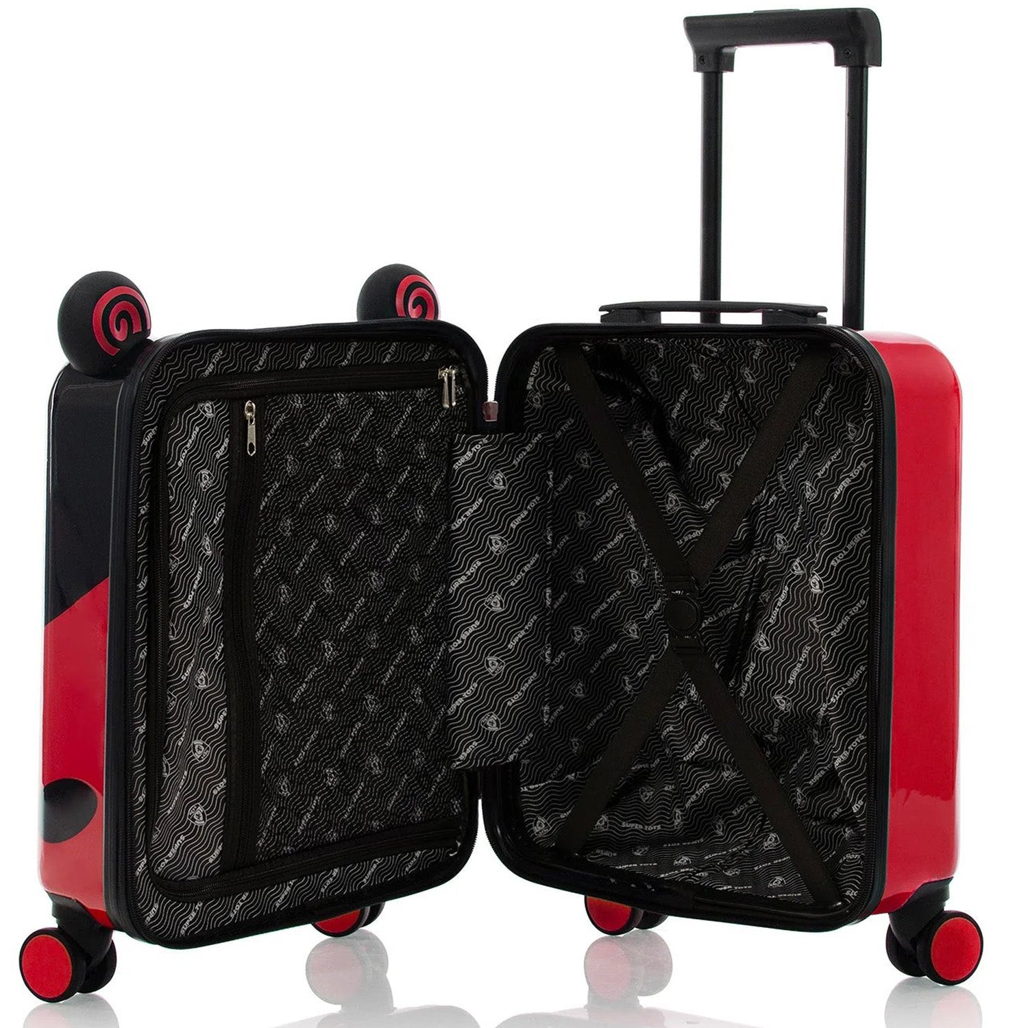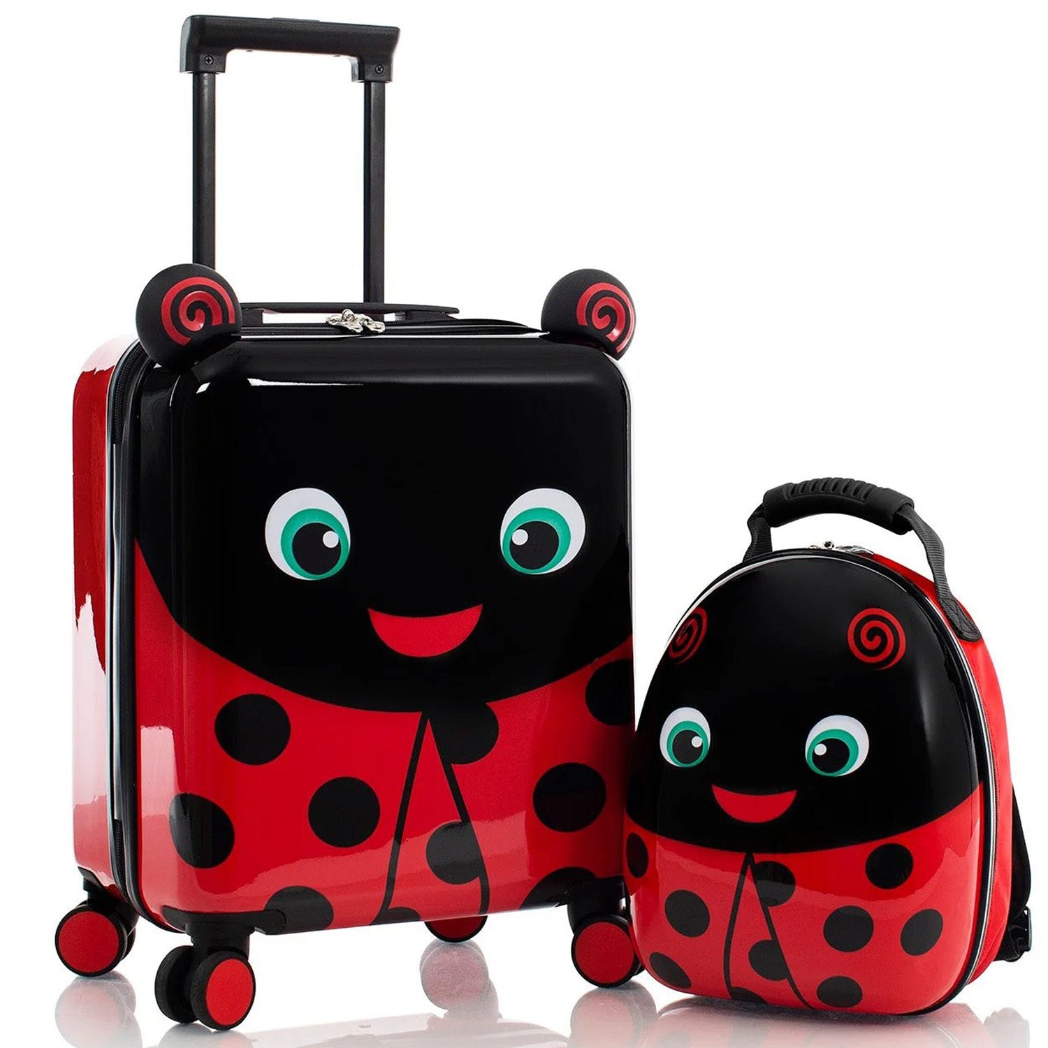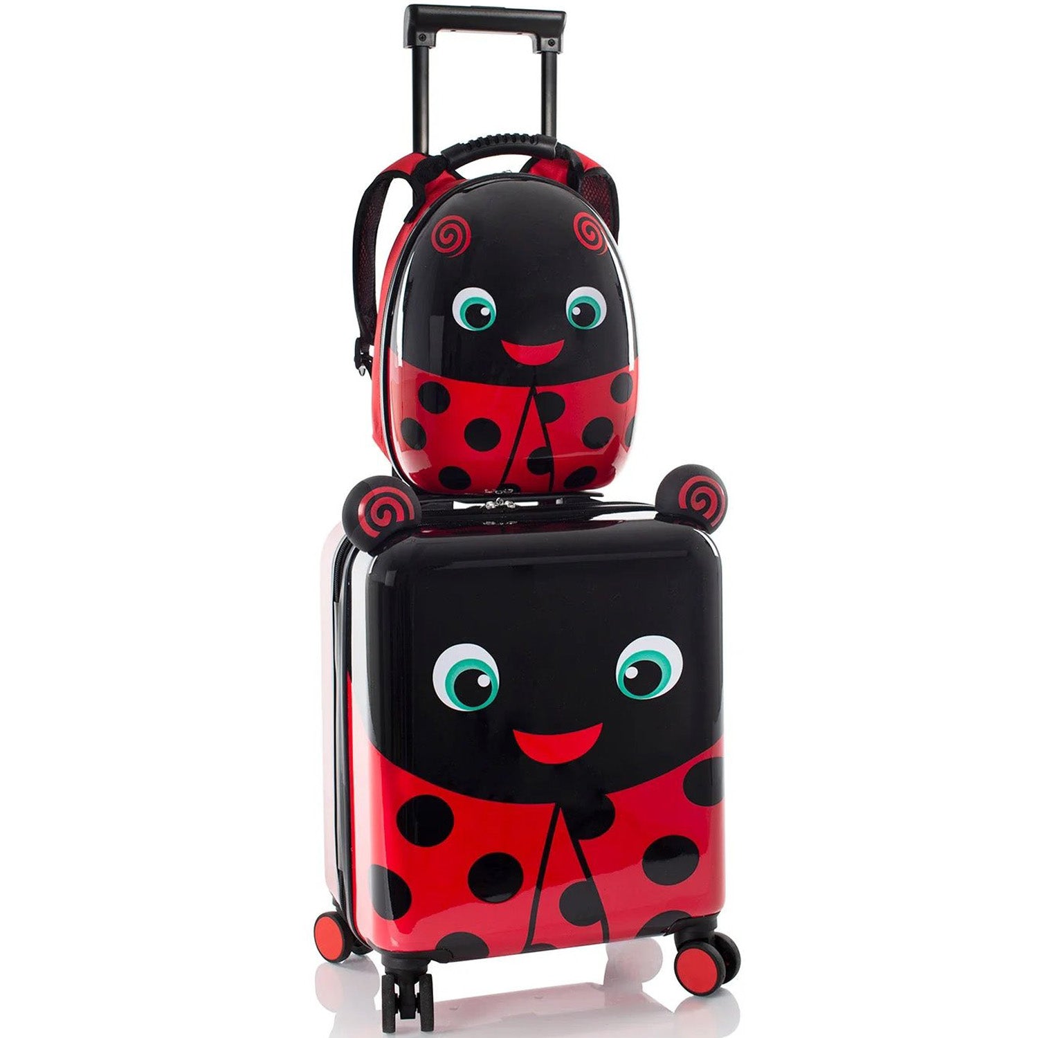 This Heys Super Tots Lady Bug Luggage & Backpack Set are high-quality cases designed with the same meticulous attention to detail as the adult Heys luggage, but in a mini size perfect for kids. They feature Dual 360-degree spinner wheels, allowing for effortless maneuverability in any direction.
