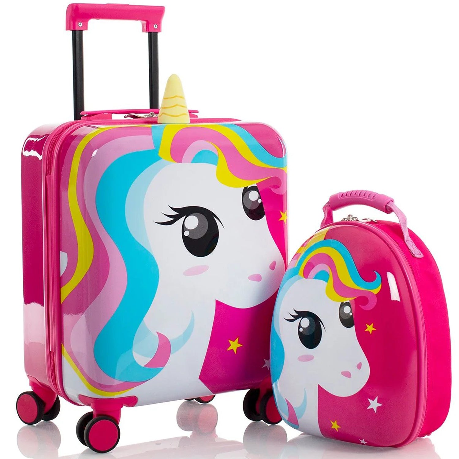This Heys Super Tots Unicorn Luggage & Backpack Set are high-quality cases designed with the same meticulous attention to detail as the adult Heys luggage, but in a mini size perfect for kids. They feature Dual 360-degree spinner wheels, allowing for effortless maneuverability in any direction.