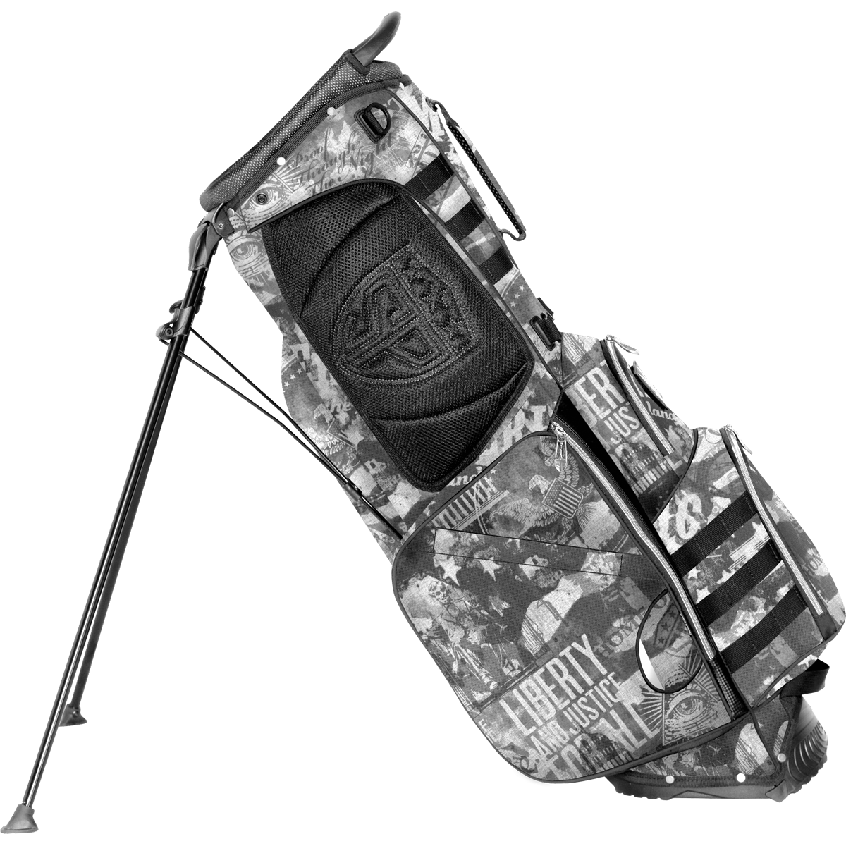 Exceptionally versatile whether you pack it or push it, the 4lb Covert Stand Bag is equipped with a feature set for either operation. When packing, the Subtle Patriot Strap automatically adjusts to custom fit any body type and continuously re-distributes the weight evenly to both shoulders. While strapped on, you’ll enjoy perfect access to your distance measuring device with a self-sealing security closure and an insulated hydration pouch. When pushing, the typical, impeding foot pedal is eliminated with the flex-foot base, providing a more stable fit on the cart. In either case, the hard shell, fleece line valuable pocket will protect your cell phone screen, electronics or other valuables from accidental damage. Don’t miss the hidden, padded “carry” pocket that allows extra protection for more private items and if 9 pockets aren’t enough, feel free to add storage through use of the Molle System.